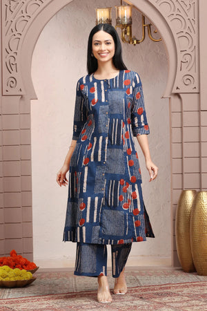 Indigo Blue Jaipuri Cotton Straight Printed Kurta Pant Co ord Set